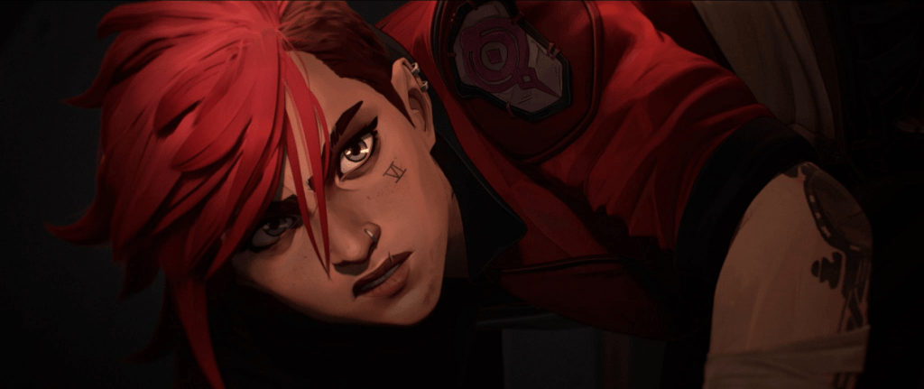 Powder is the opposite of Vi. This is demonstrated through excellent visual contrast as well as in their personalities. Powder’s hair is bright blue compared to Vi’s pink. She’s lithe and weak, but Vi is stocky, powerful. Vi solves her problems with her fists while Powder (and later Jinx) create weapons and technological feats of destruction. Powder lacks Vi’s parental burden, and she instead wishes to be valued and loved by her sister and the other orphans they run with. Her dark transformation into Jinx later in the series is understandable and a natural progression of the first act’s stakes; it’s hard to watch Jinx suffer, and her continuous conflict with Vi is heartbreaking. Vi fights only to save the ghost of her sister, an afterimage of Powder from years before. Jinx desires nothing more than to be loved and accepted by Vi as the troubled criminal she’s become. The interpersonal clash between these two characters is one of the many things that makes Arcane excellent.
