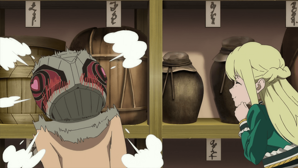 Enter Fushi, a being who has no sense of what is handsome or hideous. Gugu is baffled by Fushi’s innocence, its blind acceptance of Gugu’s mask, body, and face. While townspeople glare at Gugu or call him a monster, Fushi is happy to be in the boy’s presence. Gugu gleefully adopts Fushi as a younger brother, showers him with the attention and advice he never received from Shin. Fushi finds belonging in Gugu, Booze Man, and his companion Pyoran. Gugu inadvertently teaches Fushi about romantic love when Rean enters the distillery one afternoon; the boy’s braggadocio crumbles into bumbling pleasantries. As Rean begins spending more and more time with them, Gugu finds a melancholic contentment being with the girl he loves, even if he knows she’ll never be with him and his new marred form. Rean’s innocent affection and Fushi’s fraternal admiration empower Gugu, instill in him a confidence he’s never before had. Gugu finds strength in his new relationships and the blind acceptance only achievable when faced with overpowering love.