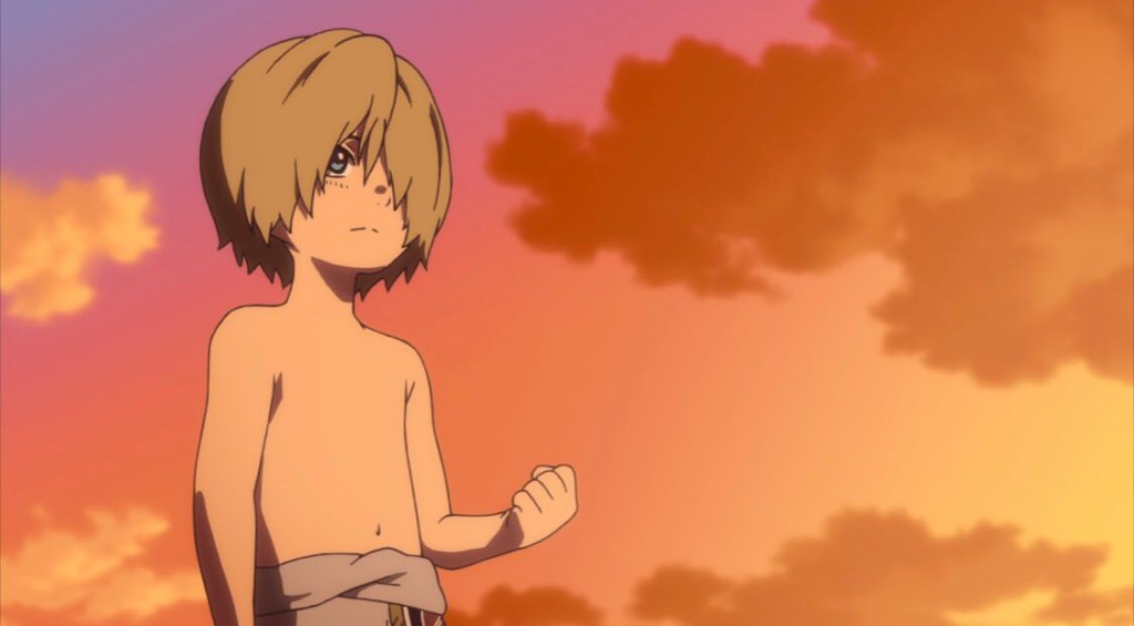 Fushi’s complex development would fail completely if the characters it encountered in its journey were not themselves each interesting and equally fleshed out. Much like Koe no Katachi‘s intricately-realized Shouko Nishimiya, Fushi’s companions each have clear desires, anxieties, and flaws. Ooima paints realistic portraits of human beings who all feel alive and different from one another. Fushi is moved and shaped by each desire of those he cherishes: March’s desire to blaze through childhood and become an adult, Parona striving to protect March’s innocence, Fushi’s first human companion longing to end his solitude and reconnect with his lost loved ones. The first true story arc features Fushi, under the guidance of motherly March and courageous Parona, developing from an infantile mindset to enter a sort of rough mental adolescence. The relationship Fushi forges with March is the blueprint for the narrative cycle that harkens back to Ooima’s work on Koe no Katachi, a model that is utilized time and again to varying degrees of success throughout Eternity‘s duration. Within this plethora of people Fushi meets from different walks of life, the most impactful story in the season is arguably that of the young Gugu.
