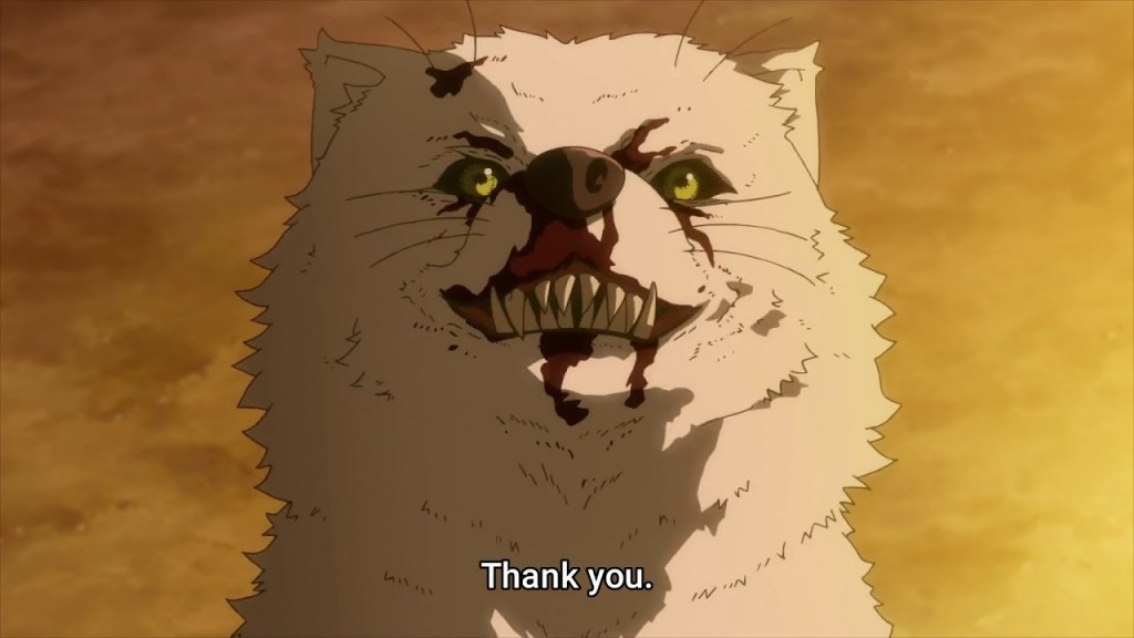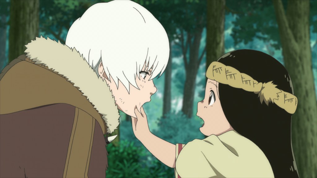 The slow evolution of Fushi consistently rewards viewers. After the first few episodes, it struggles to squeeze out words of gratitude. By the end of the season, Fushi speaks confidently in full sentences, occasionally stopping to ask the definition of a more complex word. When Fushi experiences its first personal loss, it responds with only a blank stare. After the death of a loved one in the final episode, Fushi immediately succumbs to grief and drops to its knees in violent sobs. Despite its growth and philosophical ascension, Fushi regularly slips and falls backward. In moments of anger and anguish, it adopts the form of a monstrous bear and wreaks destructive havoc on its surroundings. In one key story beat, Fushi chooses to grow four years older without changing from its primary form of a pale-haired teenage boy. Fushi enters late adolescence, gains a few inches in height, grows the wisps of a beard. It later unintentionally sacrifices this physical maturity when transforming to fight off an enemy, and finds its body deaged when returning to its boy shape. The years of growth lost represent a real person’s immature slips even into adulthood; gaining maturity is a constant cycle of advancing, failing, and advancing again. Fushi, like real human beings, becomes something of a palimpsest: even with its previous experiences written over, it never loses what is written beneath. It honors those it has lost and fights tooth and nail to retain its memories. Fushi’s trajectory from a purposeless existence to a person with their own values and goals is incredibly fulfilling, and it’s easy for audiences to anticipate the immortal being’s further growth in future animated seasons.
