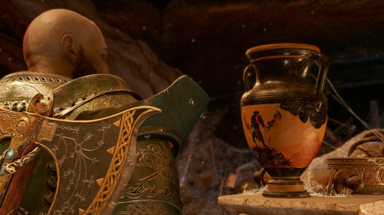 “I have nothing more to hide,” he says, arms outstretched, heart open to what lies ahead. As he catches up to Atreus, Kratos removes the pouch containing Faye’s ashes from his own waist. He hands them off to his son, his full trust for Atreus now apparent. The duo continue to climb this final mountain, entering a cave covered wall-to-wall in giant wooden plaques detailing the many prophecies predicted by the Jotnar over the ages. These carvings depict the follies of the Norse gods, of Odin and his family. They portray the pains of the Jotnar, their abuse at the hands of the Aesir. But as Kratos and Atreus reach the cave’s end, they discover a set of plaques dedicated exclusively to them, their travels presented beat-for-beat, all of their actions until now predestined. The pair discover that Faye was a famous Jotnar named Lauffey, and that she abandoned her people to live a life in Midgard. They also learn Atreus actually has another name given to him by his mother: Loki, the prolific god of mischief from Norse mythology. This narrative twist lines up with actual mythos; the mythological Loki is the son of the giants Lauffey and Fárbauti, whose role Kratos fills in God of War. Little is known of Fárbauti in actual myth, only that his name essentially means “dangerous striker.” This obscure hole in Norse mythology is brilliantly utilized by Santa Monica to simultaneously fit Kratos into their new story and honor the ancient culture they pull from.