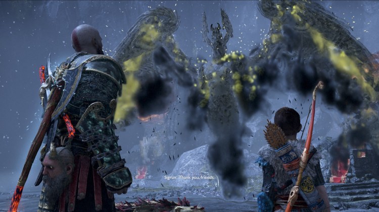 The game ends with a dream sequence, perhaps a prophecy: after returning home to sleep, Kratos and Atreus are shaken awake three years later by violent thunder. As they emerge from their cabin into a torrential downpour of freezing rain, they spot a hooded Thor who has arrived at their doorstep with motives unknown. Thor reveals his hammer, clearly prepared for a violent confrontation. But Atreus awakens, finds that Fimbulwinter has yet to fully set in. He sees his father beside him, preparing for yet another day, the future before them wide and untold. Both Kratos and Atreus have sinned, but within the other they have found forgiveness. The past is to be learned from. Ragnarök itself may be approaching, but it is tomorrow’s problem. Though they will brace for events to come, for now there is only today, another unknown journey before them. Atreus straps on his quiver and bow, follows Kratos out into the snow.
