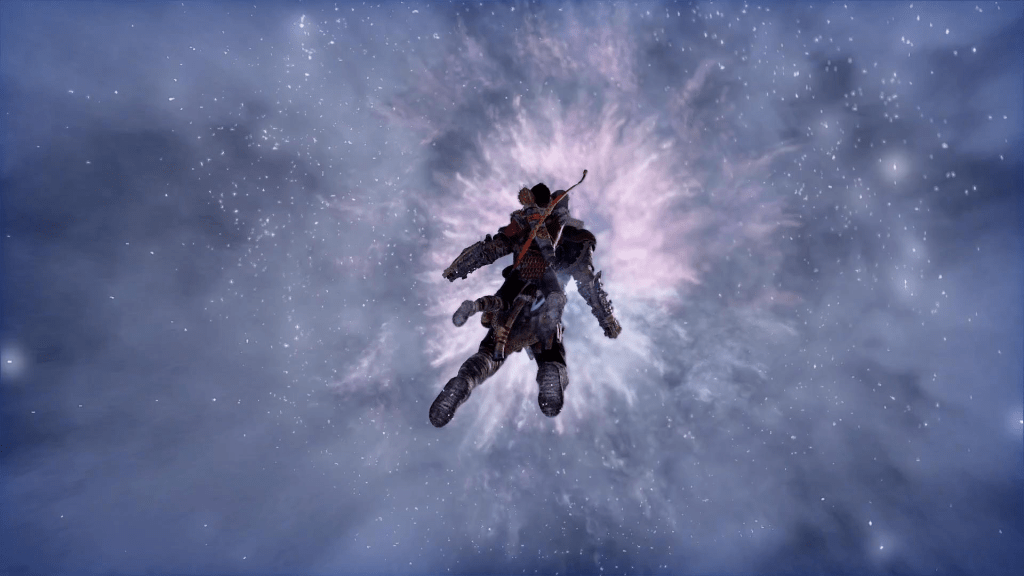 In God of War, inter-realm travel requires traversing a celestial path within a massive void referred to as the Realm Between Realms. While on this path, Kratos is warned to not stray lest he wish to suffer potentially deadly consequences. In learning how to access Jotunheim, the party realizes that Tyr utilized a magical travel rune to depart from the path; this was how he was able to visit other cultures and lands. Filled with trepidation, Kratos and Atreus realize they must depart from the straightforward road and instead explore the dangerous depths of the astronomical vacuum around them. Kratos breaks from the trail, approaches a great ledge that mirrors the very cliff he threw himself from years ago in attempted suicide, his family and any chance for happiness taken by his own bloodied hands. Kratos steps to the ledge and gazes down into the purple abyss, once again inches away from the death he once desired.