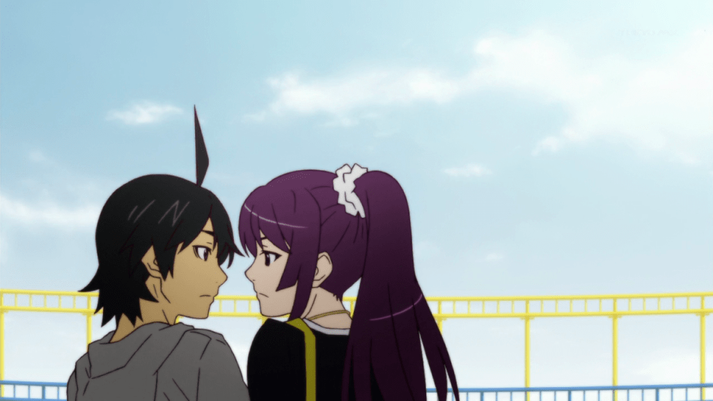 Throughout the franchise, characters point out that Araragi’s relationship with Senjougahara makes little sense from an outsider perspective. As has been established throughout Bakemonogatari, both are reserved and socially aloof, seemingly allergic to forming connections with others. While Senjougahara was once a renowned star athlete, she has since withdrawn from extracurriculars. And while she is a great student and obviously intelligent, Hanekawa is the top of the class and student council president. She is also traditionally beautiful and easily broke through Araragi’s shell long before he had ever spoken to Senjougahara. Outside observers who know both girls, such as Hachikuji, comment that they would have expected Araragi to pursue Hanekawa, that a relationship between them theoretically makes much more sense than one with Senjougahara and her defensive edge. Araragi often struggles to quantify his feelings for Senjougahara himself, wondering what draws him to her or vice versa. However, this reflects a fact about relationships in the real world: they often do not make much sense to third parties, and even those involved may have a hard time describing what connects them to their partner. Whether it is random circumstance or raw chance, bonds form between people, often seemingly out of nowhere. But all that matters is that the bond exists. In a moment of vulnerability, two people connected, and the feelings that would eventually bloom into love took root. Araragi does not need to be able to explain his relationship, to defend why it works to outside commentators. What matters is that they fulfill something within the other, that they make up for each other’s shortcomings, that they meet each other’s flaws with love and support.