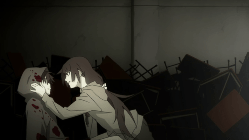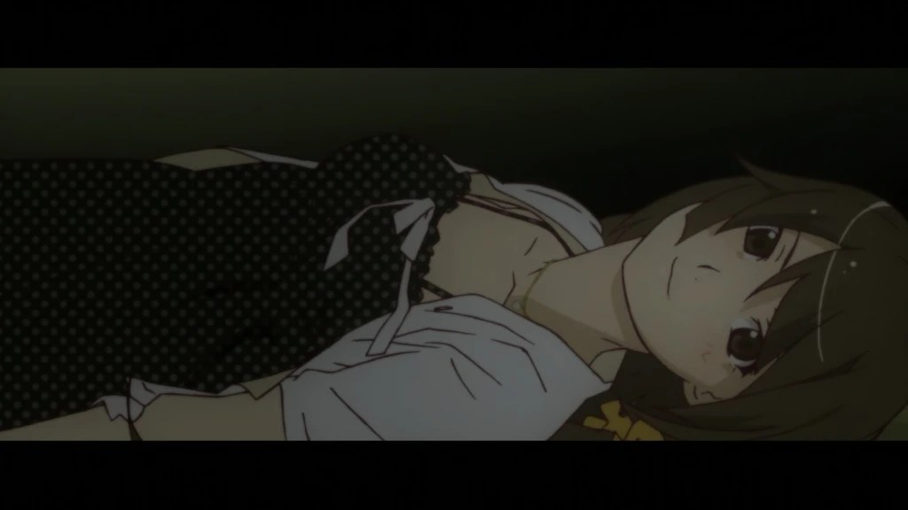 “I love you,” he says, quickly, honestly. The Hitagi Senjougahara before him is a far cry from the girl he first met, her every action veiled in a defensive hostility, the girl who once wished to never be emotionally exposed enough to be able to feel pain again. Now she expresses her deepest secrets freely with the one she loves, wanting nothing more than the emotional vulnerability she once fled from. Over the course of Bakemonogatari, Hitagi has grown into someone who is open to life and its varying emotions, willing to risk potential in order to experience moments like this with Koyomi.