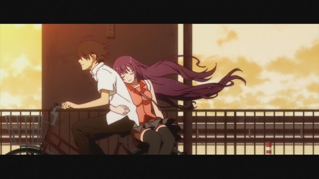During his final confrontation with Black Hanekawa, the cat apparition told Araragi that if he chooses to rescue everyone, no one will be special. She calls into question his relationship with Senjougahara, wondering what could possibly set her apart from the other girls Araragi has saved throughout the series. As Araragi calls off the search for Oshino, he and the girls mosey back into the city, chatting together as a group. However, as the girls each depart from the gathering, Koyomi Araragi is left alone with the one who matters most to him: Hitagi Senjougahara, who rides away with Koyomi on the back of his bicycle, an arm wrapped around his waist, her head leaned against him. In the end, Black Hanekawa was wrong about the nature of Araragi’s relationships; although he has formed special bonds with each of the girls, none of them compare to his connection with Senjougahara, his special one. They are two people drawn together by their many similarities, stark differences, painful pasts, and hopes for the future. This moment of solace is repeated many times throughout the greater Monogatari franchise; at the end of many of the series’s story arcs, Koyomi returns from some final skirmish to Hitagi, who is always waiting with a knowing smile, with open arms.Bakemonogatari is a difficult series to define. An argument can be made that it fits many different genres: there are certainly elements of horror, of mystery. However, the most fitting label has to be romance, and Bakemonogatari is one of the finest in the genre. Under the layers of supernatural violence and monster possessions, the core of the series revolves around two people finding love and working to improve themselves in order to allow that love to blossom and breathe. With Araragi and Senjougahara, original creator Nisio Isin and studio Shaft present a love story that rises above its medium, one that presents two flawed, fully-realized characters and a bond from which viewers can learn the importance of self-improvement—not only for oneself but for the health of their relationships. At its heart, Bakemonogatari teaches its audience how to choose themselves, how to open up to others, how to love fully.