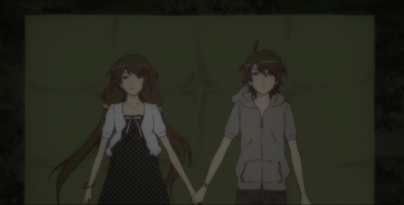 But here Hitagi cuts to the truth of her overt sexuality, confessing that she fears to actually be physically involved with Koyomi. There is a compelling and complex contrast between Hitagi’s gradually developed emotional vulnerability and her inability to be sexually vulnerable. It rings true for many people in relationships, that despite growing and slowly becoming more open to your partner, various traumas and past pains may leave some elements of a relationship closed off to you still. Hitagi associates sex with her past assault, and she is afraid that doing this with Koyomi will lead her to loathe him, that such loathing will drive him away in the end. This is the hardest truth of all, and makes all “fan service” involving Senjougahara earlier in the series make perfect sense; it is her coping mechanism, her attempt to take ownership of her trauma, despite the lingering fear of her body and potentially having sex with others. This serious and complex exploration of sexual trauma is often avoided in media, particularly in the medium of anime, where sex is so often used exclusively as a punchline. And instead of struggling for the right words, searching for some cool thing to say, Koyomi responds honestly, in the best way he possibly could: silently, he simply takes Hitagi’s hand.