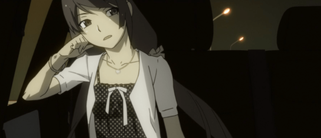When Araragi arrives at Senjougahara’s home, he realizes he will soon face a fear shared by many young people in new relationships: their driver for the evening will be none other than Hitagi’s father. Throughout the drive, Araragi fidgets in the backseat, anxiety on display. Hitagi toys with him, asking him questions relating to his feelings and physical attraction to her. If he appears despondent, concerned about her father in the front seat, Hitagi playfully accuses him of not caring for her. At times when he respectfully refers to her as Senjougahara, she informs her father that Araragi has something to say to him. This forces him into a corner that he must use her first name, Hitagi, to get out of, a gesture in Japan that betrays a close intimacy—which normally would not be a problem, were it not for Hitagi’s silent father behind the wheel. Throughout the car ride, Monogatari‘s penchant for depicting close point-of-view comes into play. As usual, the camera follows Araragi’s perspective, frequently cutting from close-ups of Hitagi to her father’s side profile, the glimpse of his reflection in the rearview mirror. This creative technique easily conveys Araragi’s nerves, his tendency to glance up to the Senjougahara father when the daughter says something particularly provocative. Occasionally, while Hitagi grills and teases Araragi, her fingers crawl over his thighs, toying with him in an attempt to arouse and further embarrass him. However, when Araragi blinks, Hitagi is across the backseat from him, her hands kept to herself. This is one of the best examples of Monogatari‘s use of perspective and unreliable narration; it is unclear what is actually happening and what is simply Araragi’s hormonal imagination.